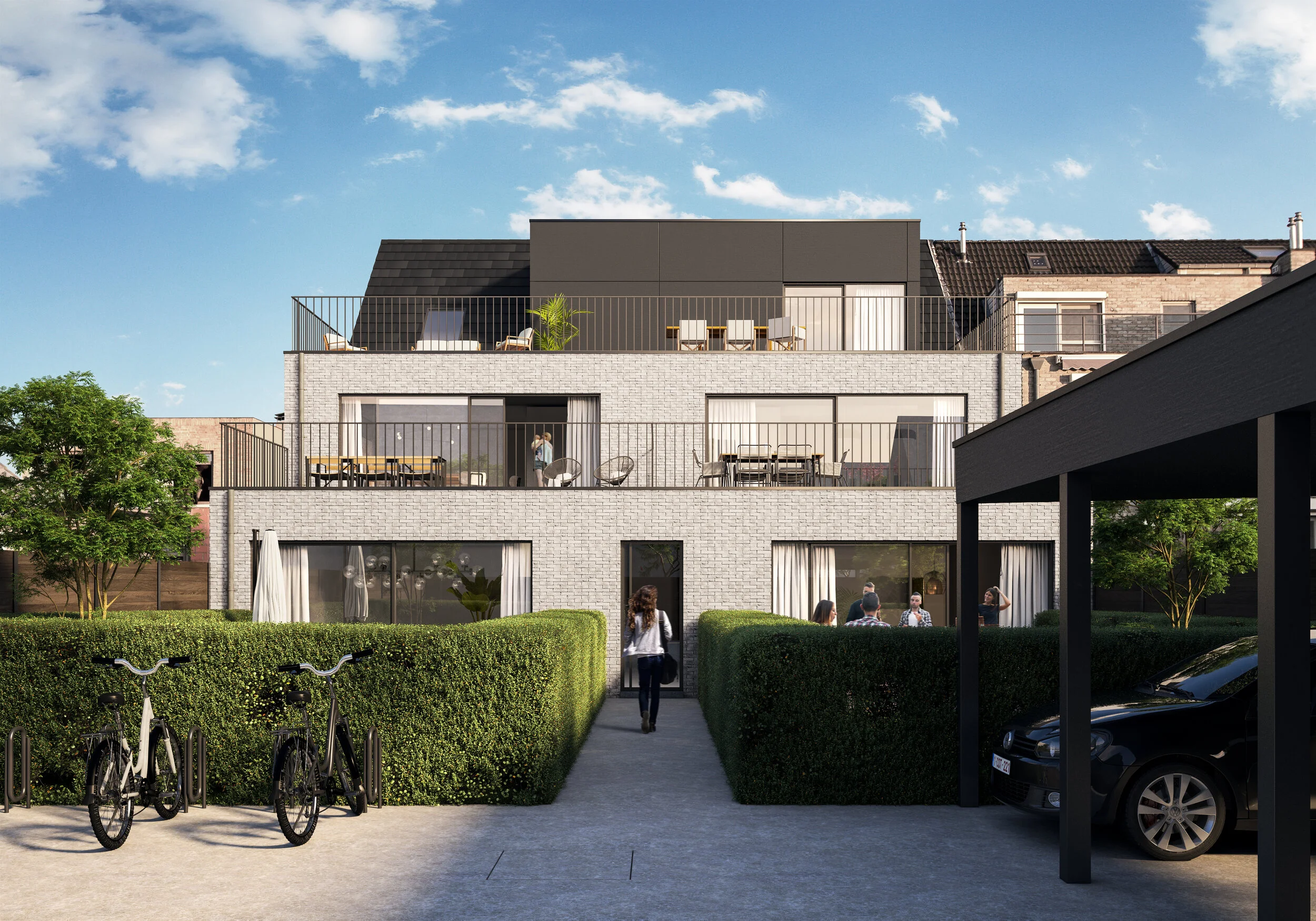 Achter de residentie is er voor elke woonunit een carport voorzien en een gemeenschappelijke fietsenstalling. Vooraan het gebouw wordt er een aangeplante tuinzone voorzien.